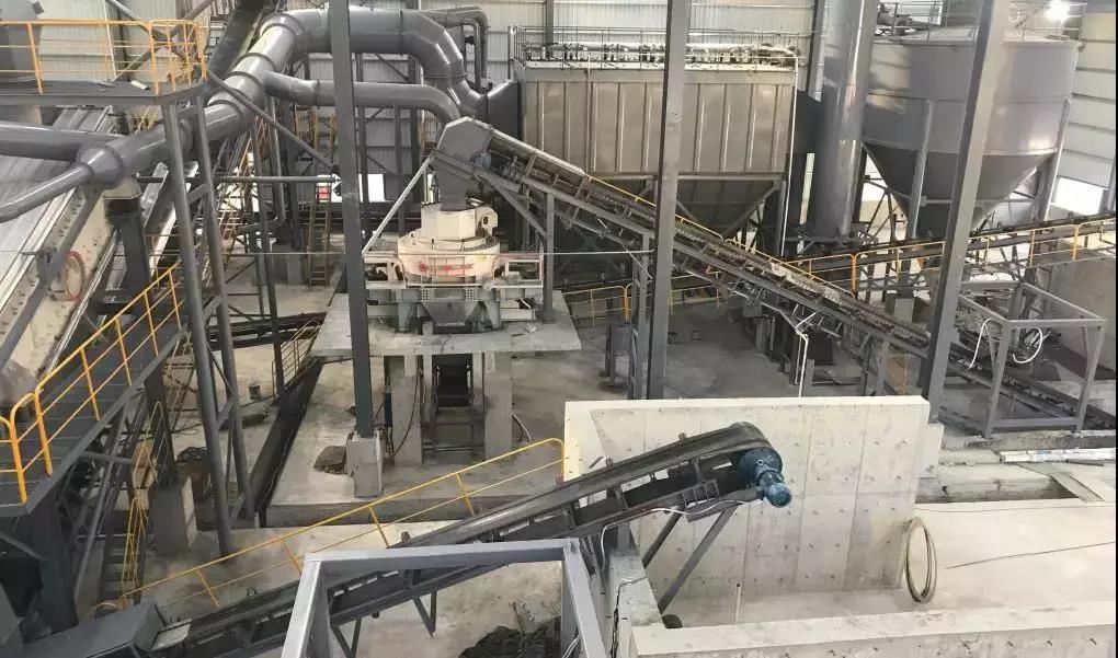 首先,石料由粗碎机进行初步破碎,破碎后的粗料由胶带输送机输送至细碎机进行进一步破碎,细碎后的石料经振动筛筛分,满足制砂机进料粒度的石子进制砂机制砂,不满足进料粒度的石子返回细破再次破碎直至符合要求。进制砂机的石子制砂后经振动筛筛分符合成品要求的经洗砂机(可选)清洗后输送至成品堆,不符合要求的返回制砂机再次加工,直至符合成品要求。